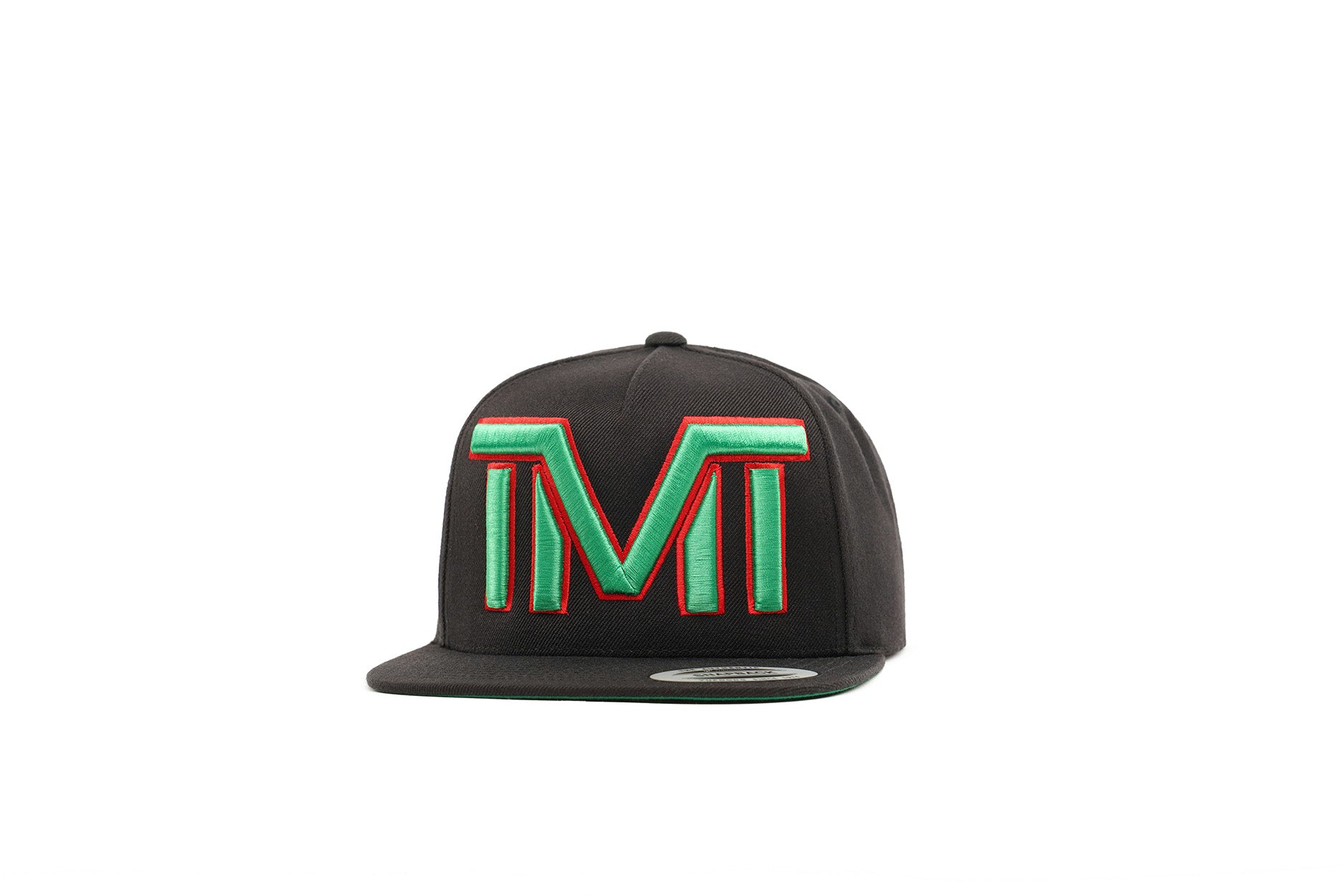 The ESSENTIAL headwear is the everyday snapback. Our iconic “TMT” is embroidered in a clean and luxurious 3D in green with red stitched outline on the front side.