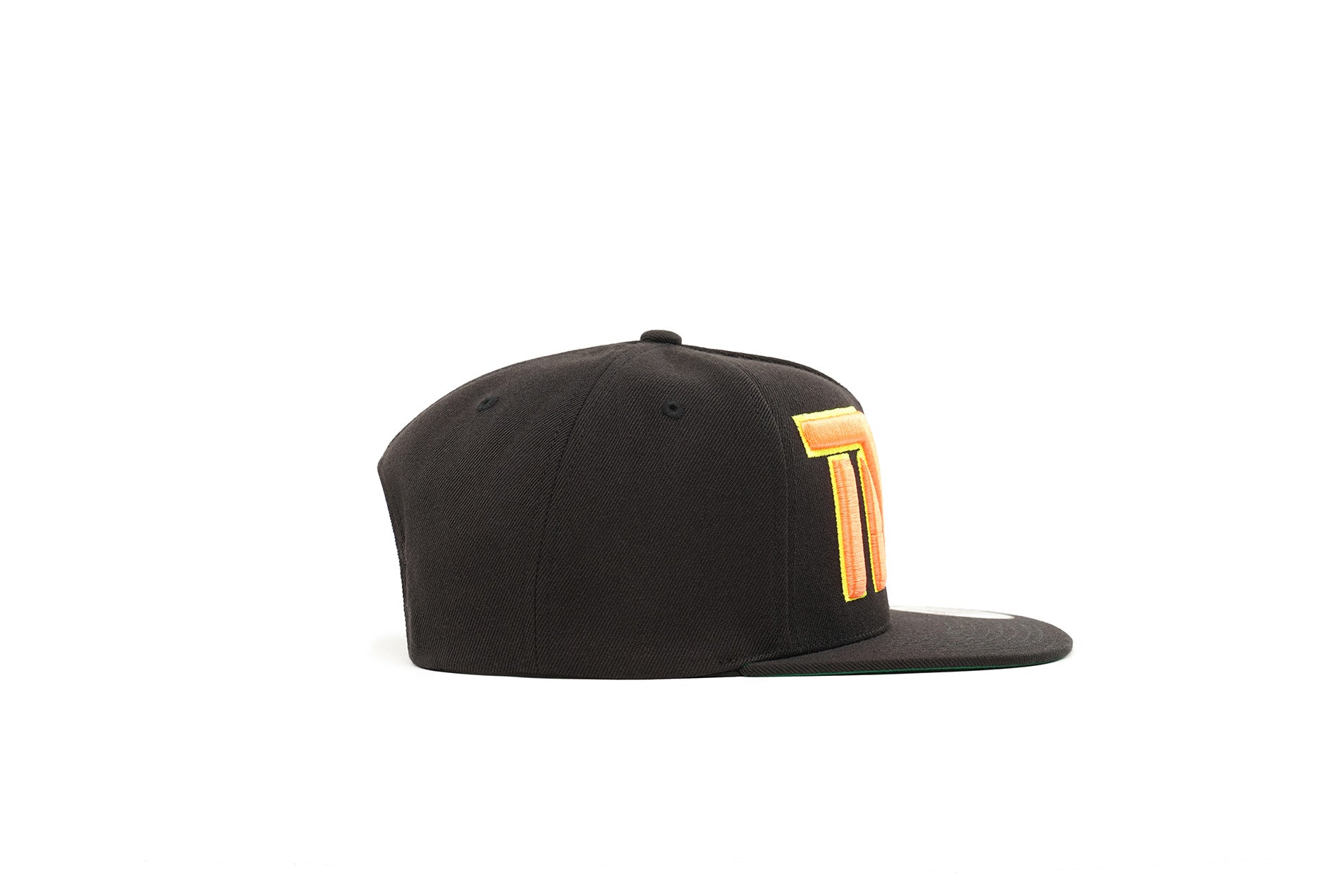 The ESSENTIAL headwear is the everyday snapback. Our iconic “TMT” is embroidered in a clean and luxurious 3D in orange with yellow stitched outline on the front side.