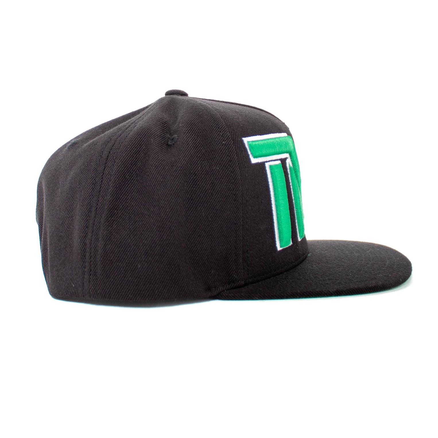 The ESSENTIAL headwear is the everyday snapback. Our iconic “TMT” is embroidered in a clean and luxurious 3D in green with white stitched outline on the front side.